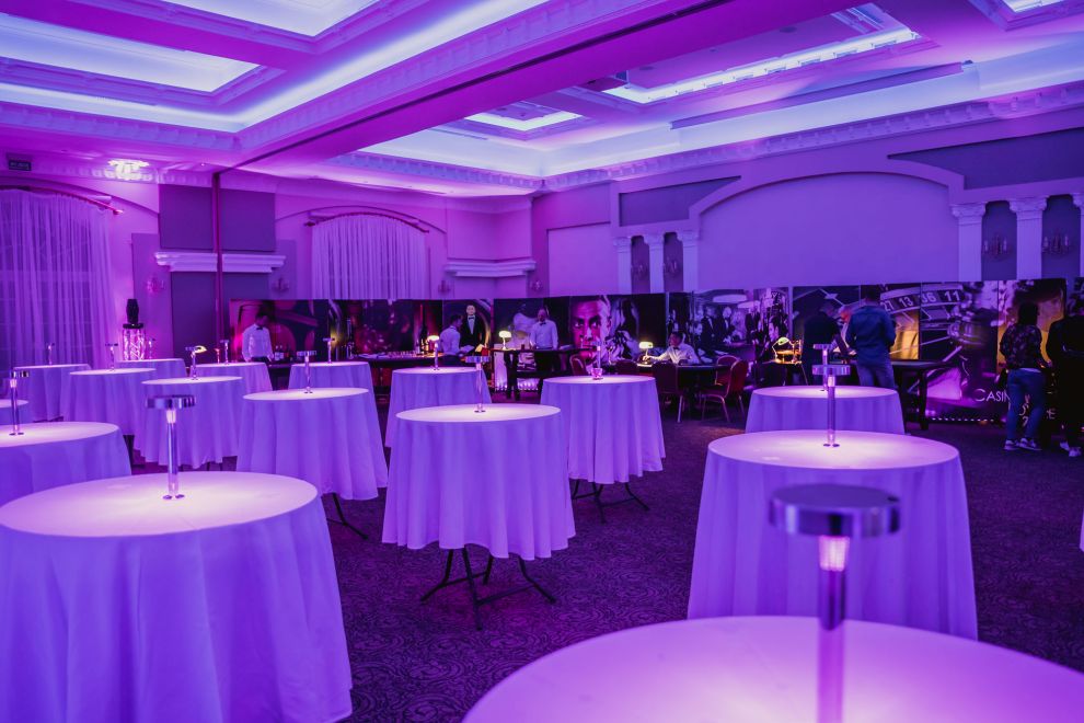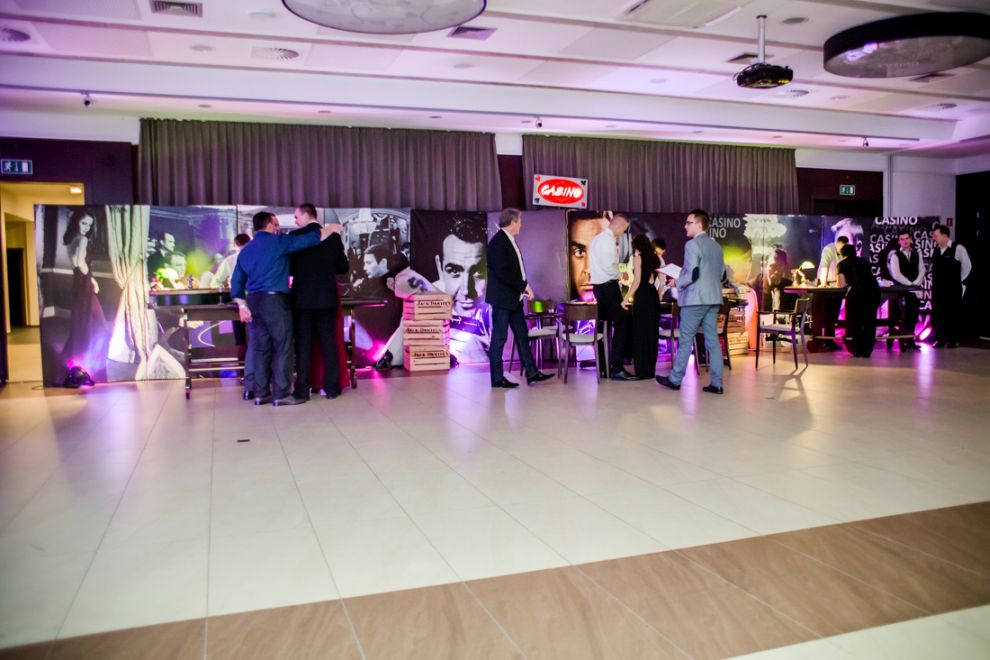 - projektor Gobo – motyw BONDA - dodatkowe Standy w klimacie Casino Royale o łącznej powierzchni - 24 m2 - klastry filmowe 6 sztuk - figurka James Bond – Daniel Craig - podświetlany napis – 007 - dodatkowe białe skrzynki z LOGO $ oraz worki pełne kasy - oświetlenie LED – 25 punktów LED